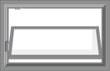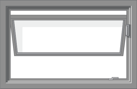 An awning window has a top sash that is hinged and opens by pivoting outward from the bottom using a crank handle.
